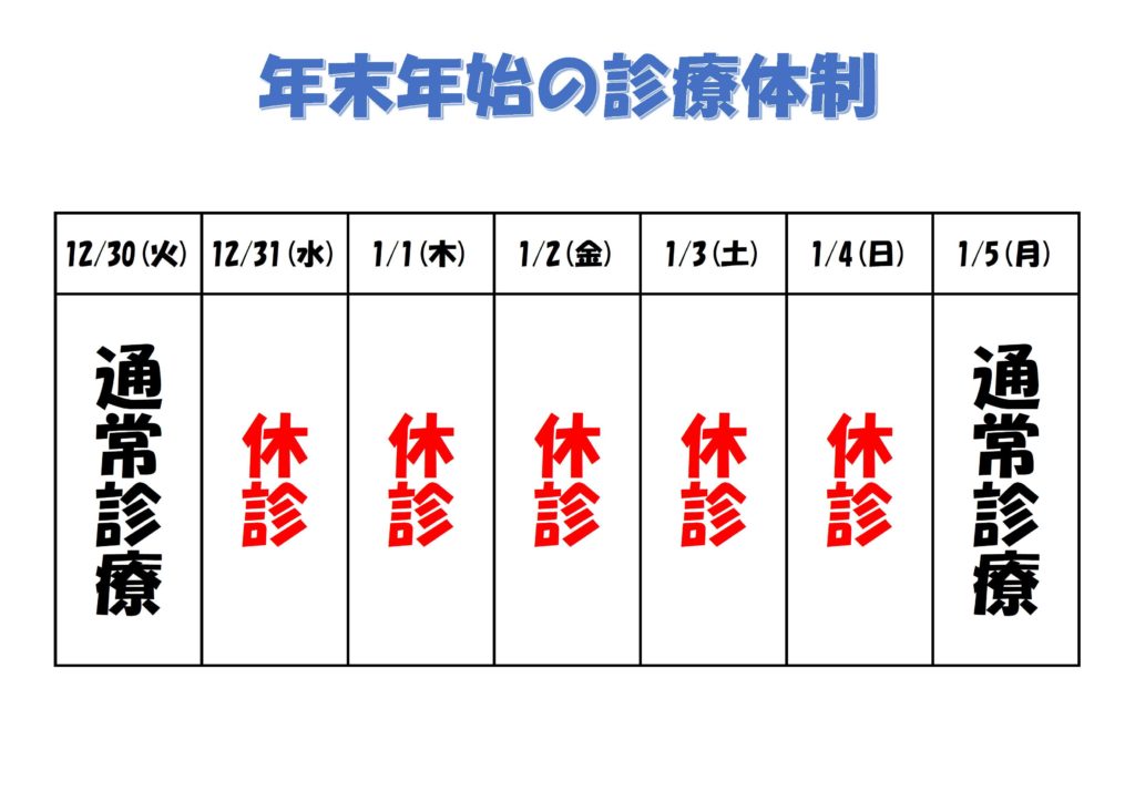 年末年始の診療については下記の通りとなりますので宜しくお願い致します。